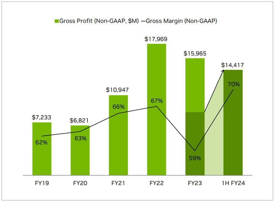 엔비디아의 수익 구조는 계속 나아지고 있습니다. 아래 그림을 보시면 2024년 전반기만으로도 2023년 일 년간의 매출 총이익과(Gross Profit) 비슷한 수준이 달성될 것으로 예상하고 있습니다. 특히나 가장 주목하셔야 할 부분이 매상 총이익(Gross Margin)입니다. 매출 총이익(Gross Profit)이 벌어들이는 수익을 금액화 한 수치라면, 매상 총이익(Gross Margin)은 한 개의 상품을 팔았을 때 얼마의 퍼센트를 수익으로 갖게 되느냐 이기 때문입니다. 엔디비아의 매상 총이익(Gross Margin)이 2023년에 59퍼센트였던 것에 비해 2023년에 70퍼센트로 크게 개선될 예정입니다. 즉, 1달러만큼 판매를 하면 59센트를 남겨먹던 것에서 70센트를 남겨먹게 되는 것이니 정말 큰 수익 구조의 개선이라 볼 수 있습니다. 아마 이러한 예상치가 엔비디아의 주가를 500불까지 끌어올리고 있는 원동력인 것 같습니다.